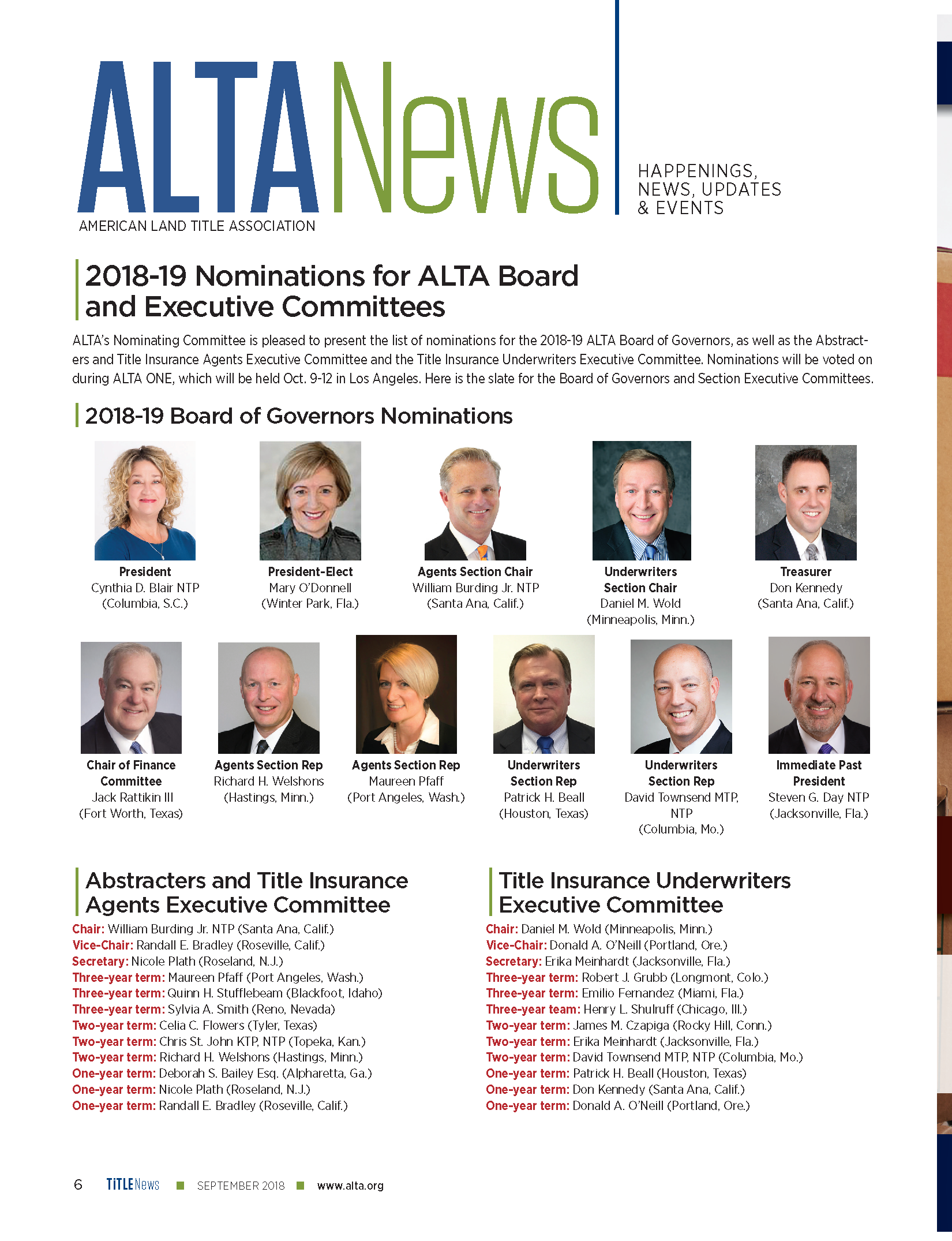 ALTA’s Nominating Committee is pleased to present the list of nominations for the 2018-19 ALTA Board of Governors, as well as the Abstracters and Title Insurance Agents Executive Committee and the Title Insurance Underwriters Executive Committee. Nominations will be voted on during ALTA ONE, which will be held Oct. 9-12 in Los Angeles.