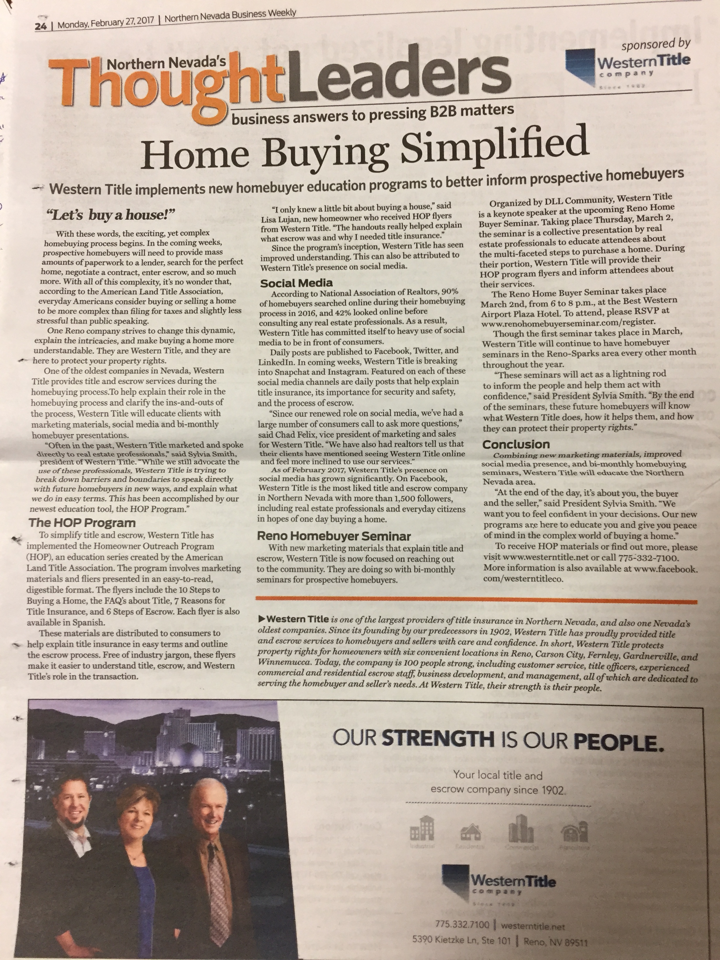 In Nevada, Western Title Co. purchased an advertorial in its weekly business newspaper. The full-page advertorial titled “Home Buying Simplified” describes how Western Title implemented HOP to better inform consumers about the home-buying process, including the benefits of title insurance and escrow.