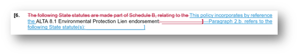 - Short Form ECRLP Policies (Assessment Priority and Current Assessments versions): The revision will resolve problems with incorporating a state statute as an exception, by reference to Schedule B in the updated versions. The revised version enables incorporation of the appropriate state statutes directly by incorporating Endorsement 8.1 (Environmental Protection Lien). A redline of the change is as follows: