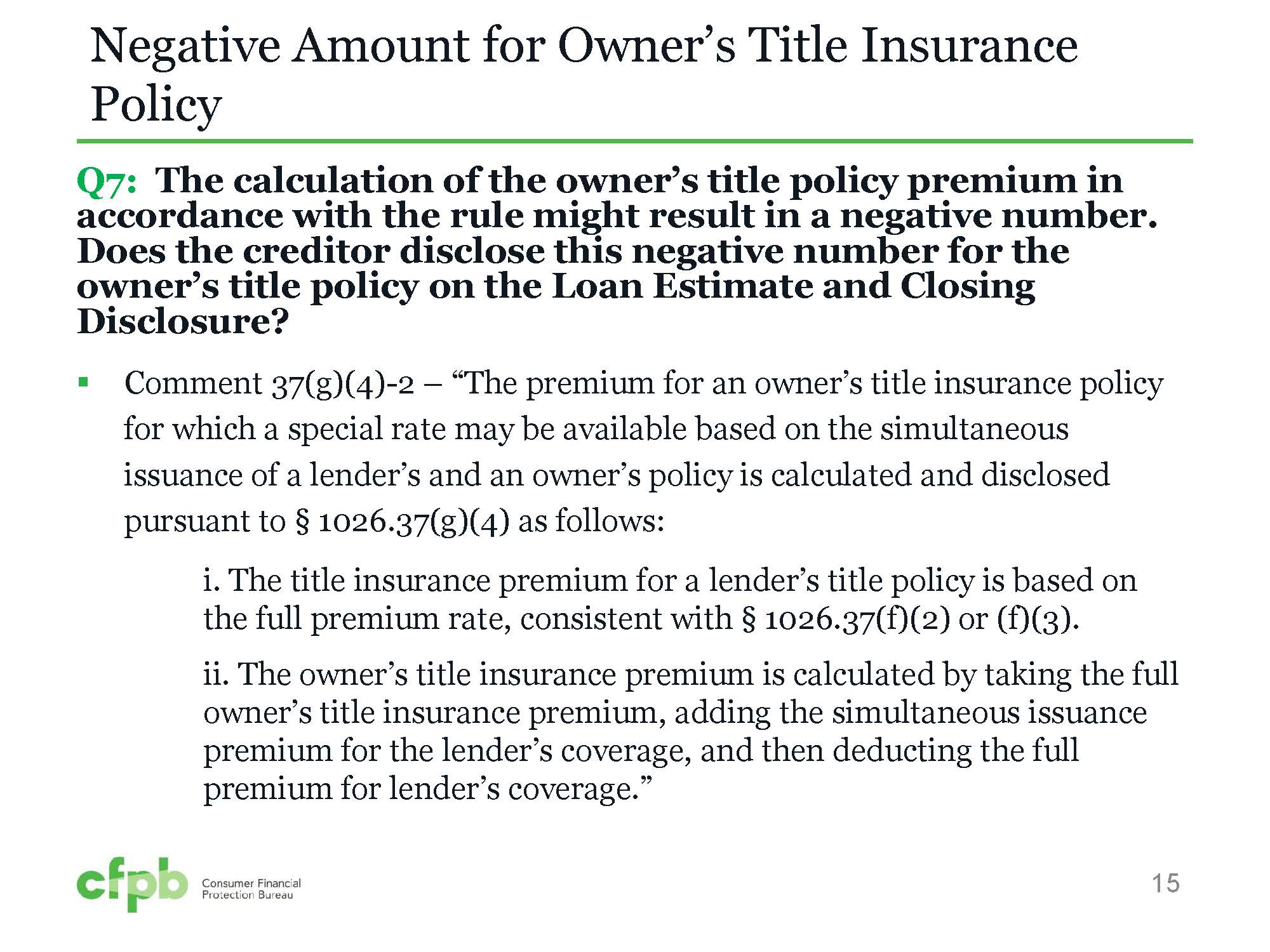 Dania Ayoubi, counsel in the CFPB’s Office of Regulations, said that in this situation, the creditor would disclose the premium for the owner’s policy as a negative number.