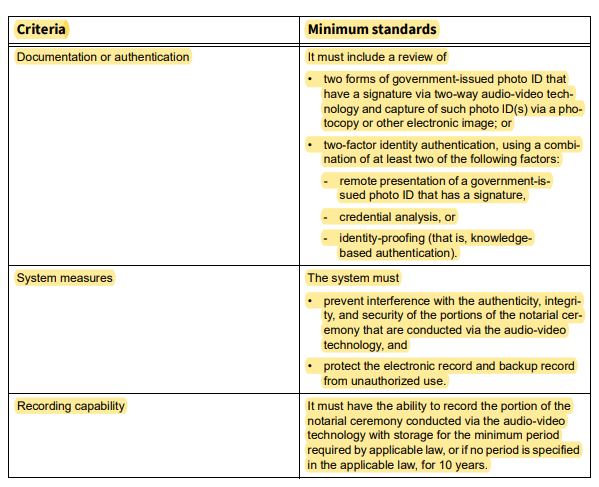 The RIN standards address documentation or authentication (including minimum audio-visual requirements), system requirements and recording capability.