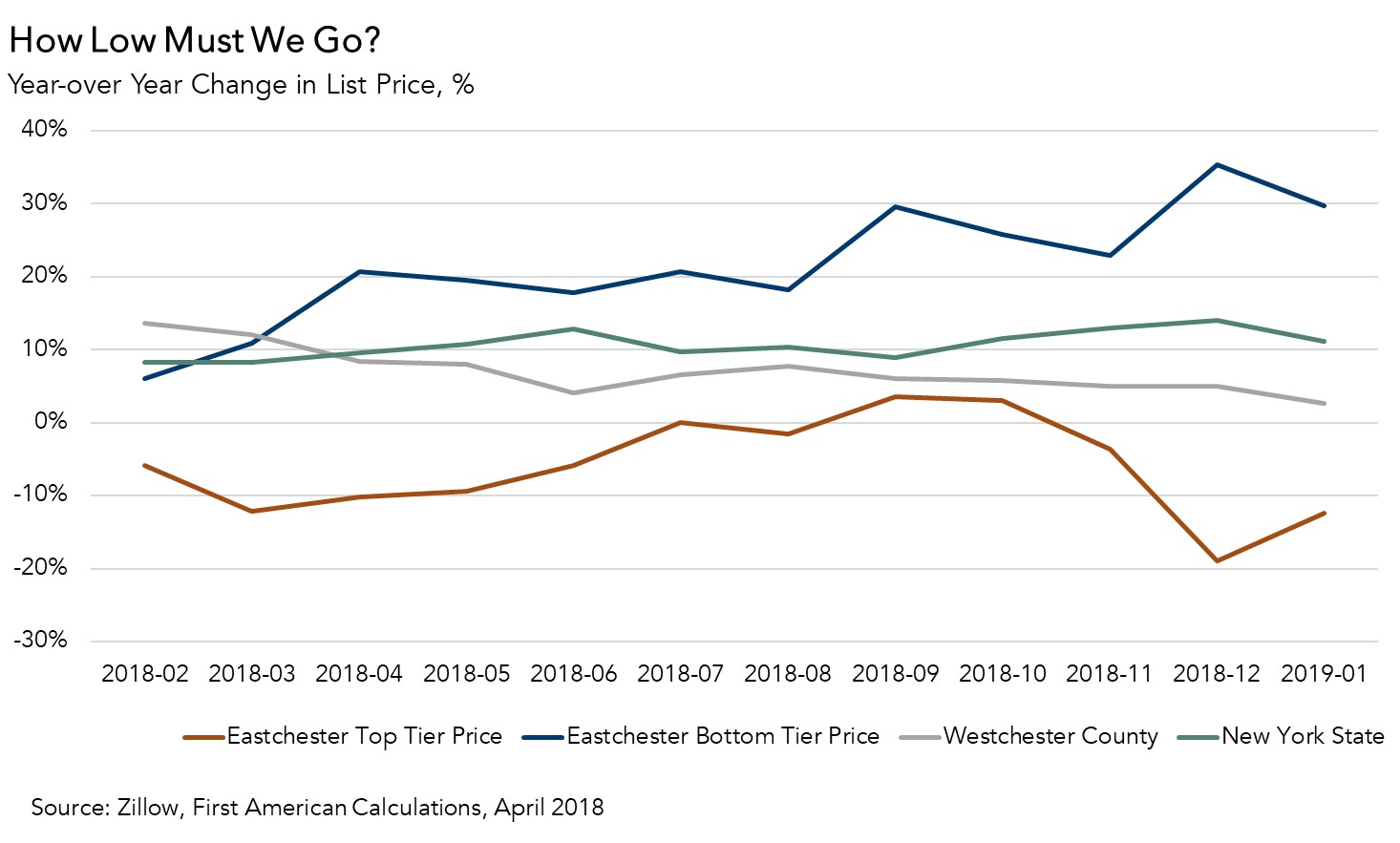 Now, let’s move zoom in to the town level. In Eastchester, a town in Westchester County, we find that homes in the bottom third of house prices increased 30 percent from January 2018 through January 2019, according to Zillow data. In that same time period, the list price of homes in the highest-priced third of the market in Eastchester declined by 12.4 percent. This analysis aligns with what real estate professionals are seeing on the ground in high-priced markets, such as the Hamptons. It seems the tax law may have reduced demand at the highest price points of high-cost markets, causing prices to fall. So, only once we zoomed in to the town level did signs emerge of any impact from the tax law change.
