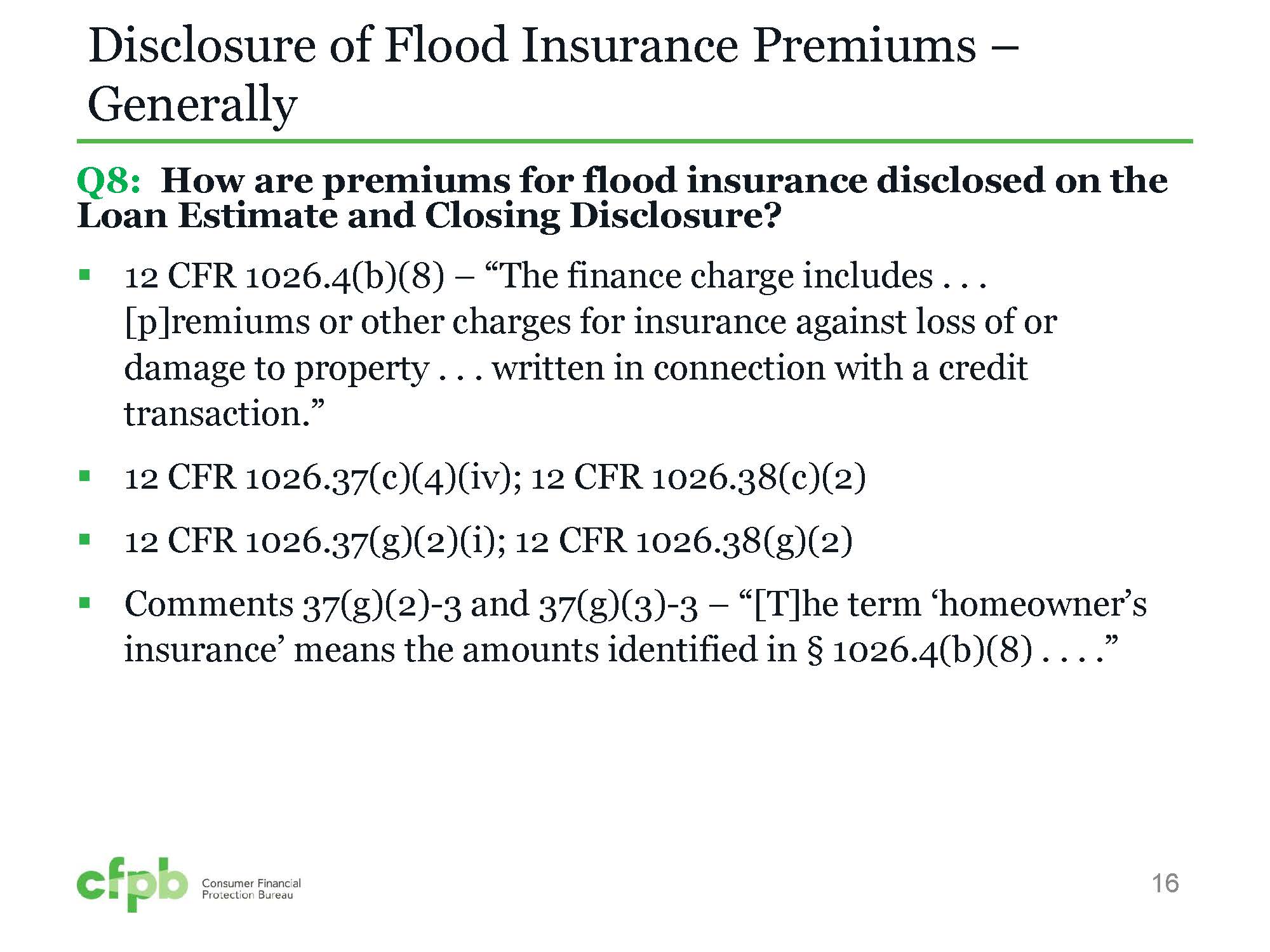 The CFPB staff stated that the term “homeowner’s insurance” as used under the rule includes flood insurance. Specifically, the CFPB staff stated that “homeowner’s insurance” under the rule means, “the amounts identified in § 1026.4(b)(8), which include premiums for insurance against losses or damage to property written in connection with the credit transaction.