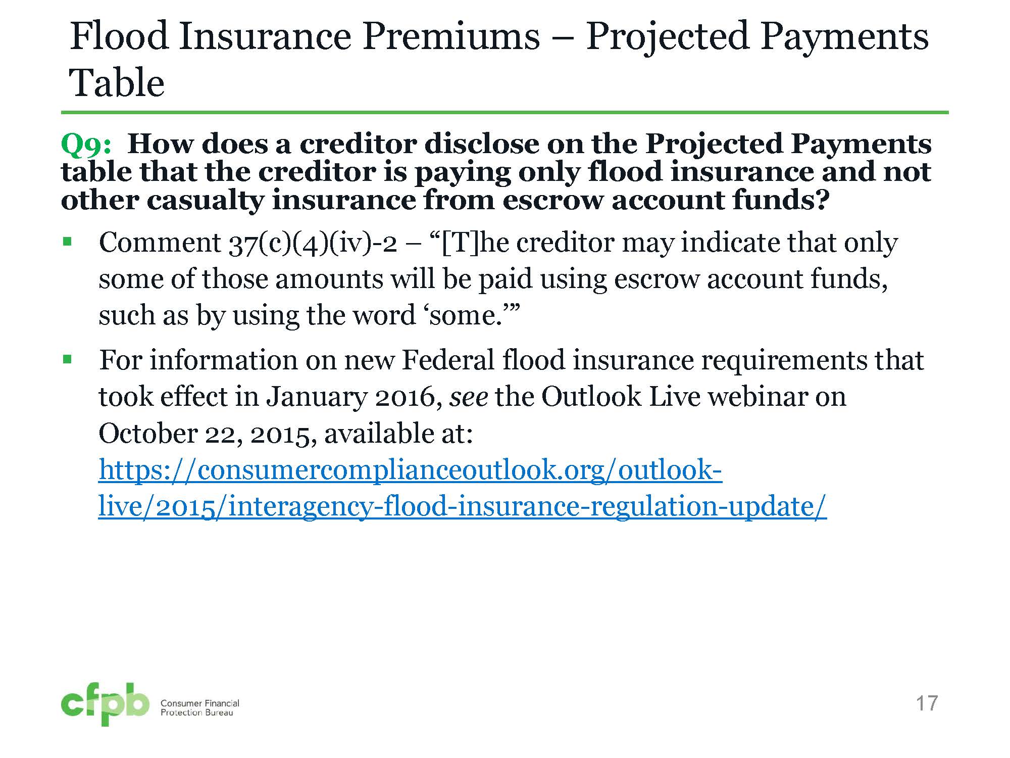 As such, flood insurance is treated under the rule, and more generally under Regulation Z, as other casualty insurance, such as homeowner’s insurance.” CFPB straff noted that flood insurance may be disclosed on the forms under the Estimated Taxes, Insurance and Assessments in the Projected Payments table in the Homeowner’s Insurance line. Tthe box for Homeowner’s Insurance would be checked, and Yes or No would be indicted to state whether it is escrowed, according to the webinar. In addition, in the Projected Payments table, the Escrow amount would include any amount escrowed for flood insurance.