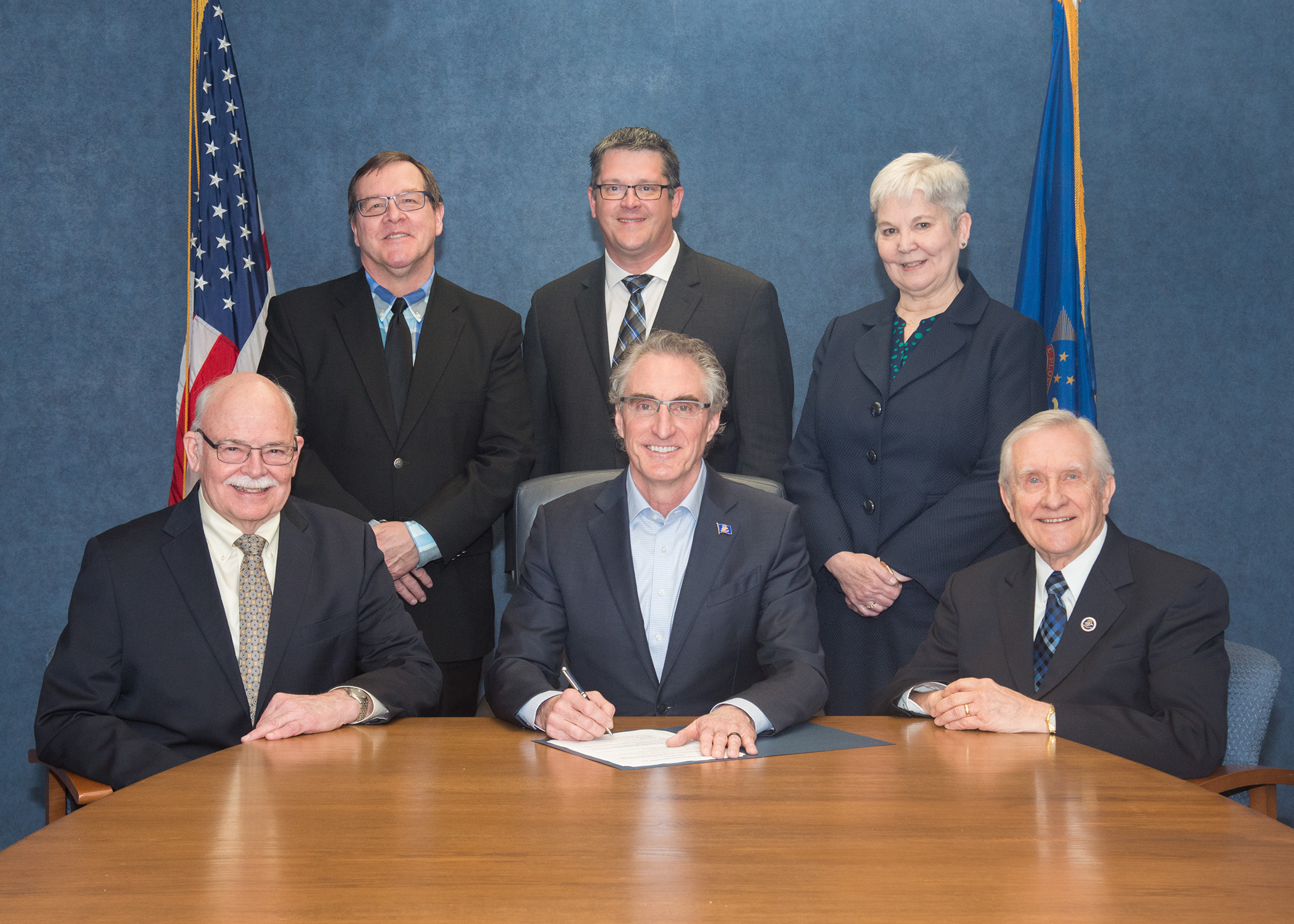 In the picture to the right are: Front row: Secretary of State Al Jaeger, Gov. Gov. Doug Burgum and House Speaker Larry Klemin; Back row: Parrell Krossman of the Consumer Protection Division of the North Dakota Attorney General's Office, Nick Hacker, president of North Dakota Guaranty & Title, and Judge Gail Hagerty; Not pictured is Michael O’Neal of First American Title Insurance Co.