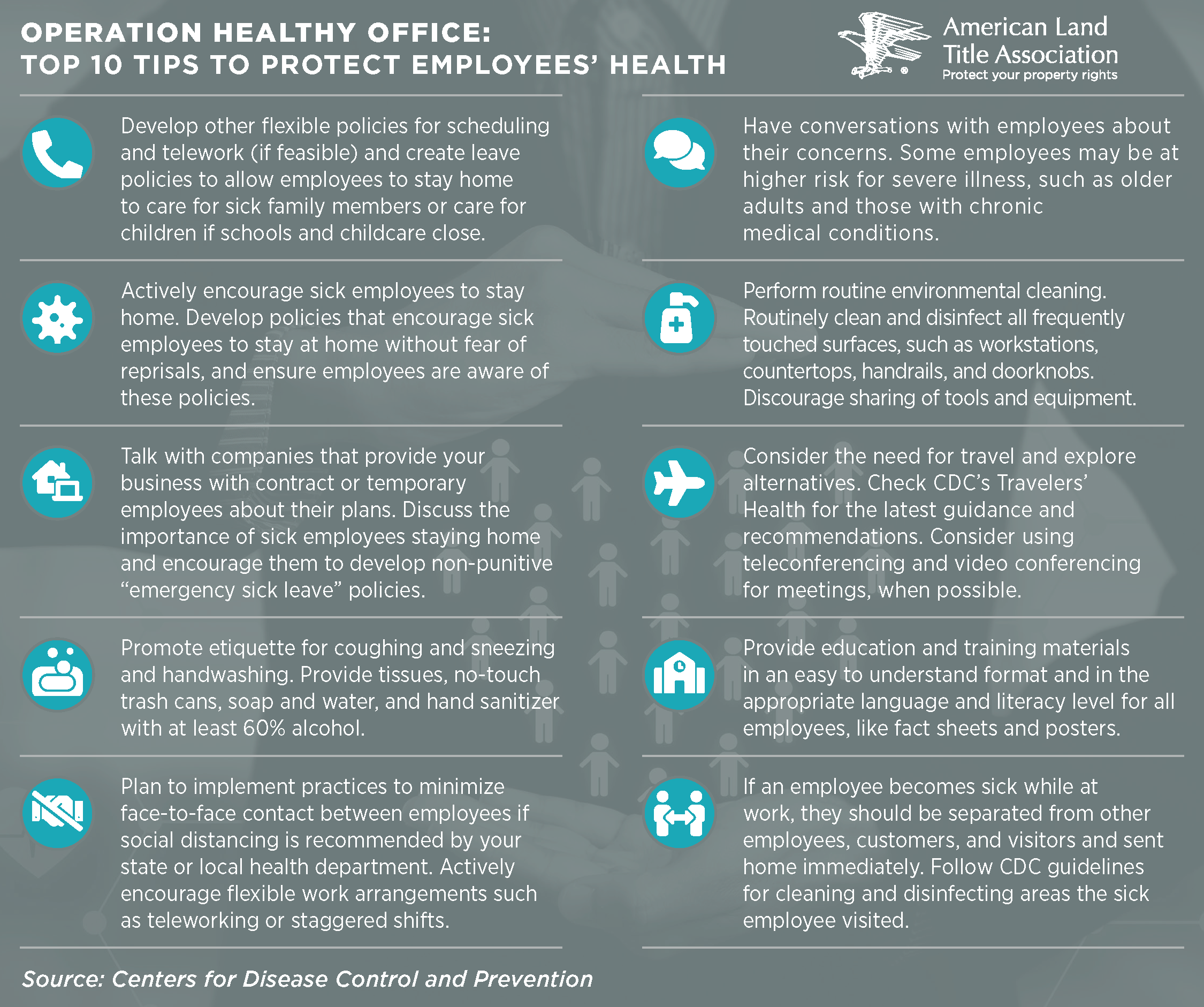For the title and settlement industry this mainly involves masks and gloves. Whether a company must require employees to wear masks will be determined by local and state guidance, according to Farmer. The CDC only recommends face coverings. If a company requires masks, this becomes a respiratory program under OSHA and must adhere to its rules.