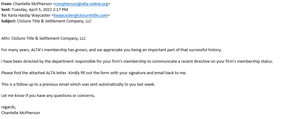 Like title and settlement companies, email from ALTA staff can be spoofed. In the latest scheme, a phishing email appears to come from Chantelle McPherson, asking recipients to fill out the attached letter and send it back.
