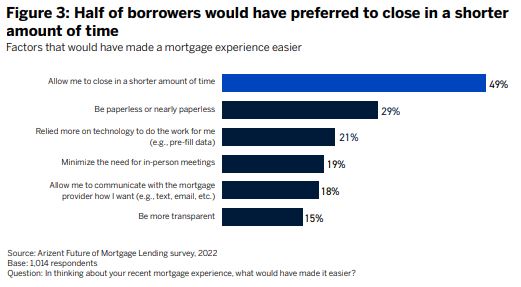 Overall, 49% of borrowers said faster closings would have resulted in a better experience for them, far outpacing other factors, such as paperless transactions at 29% and enhanced technological efficiencies at 21%.