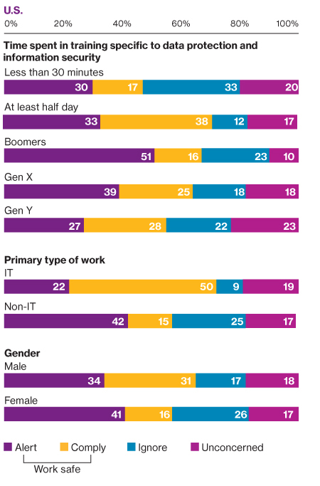 Such results inevitably lead to employees with different levels of understanding, accountability or engagement with cyber risk management. It may benefit companies, therefore, to segment their awareness training and other learning tools in order to refine an approach for different groups of employees/workers. For example, executive-level employees may need more training on confidential corporate information and use of company devices while traveling in foreign countries, while HR training may focus primarily on protection of employee data.