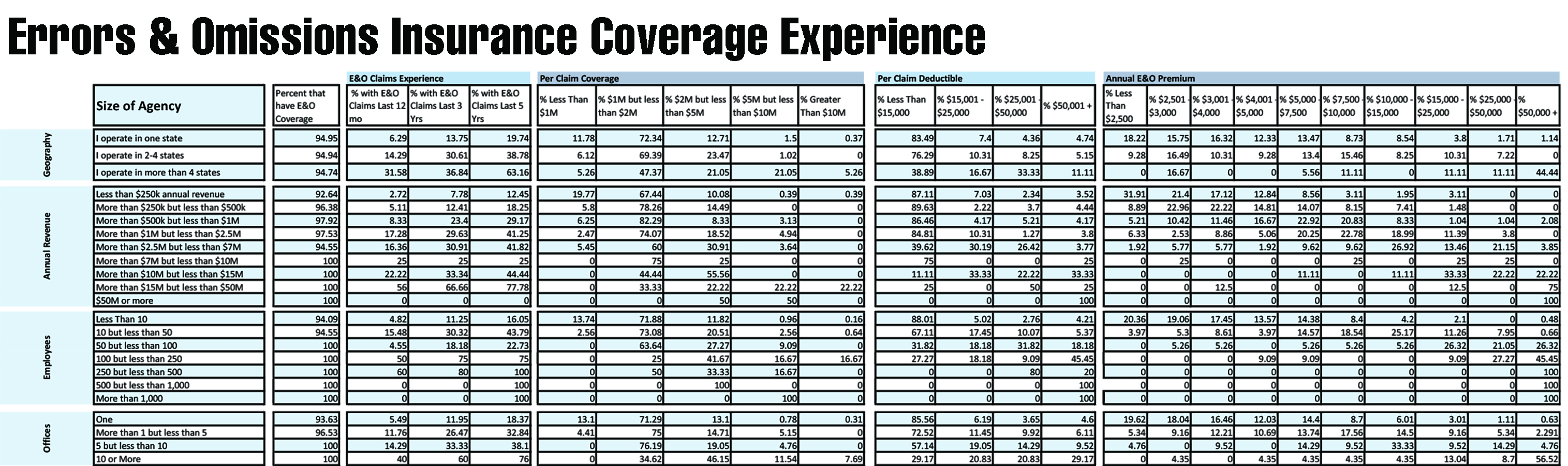The survey found that larger title companies are more likely to have E&O policies. All title companies with more than 50 employees reported having E&O insurance. This compares to 94 percent of title agents with less than 10 employees that have E&O policies.