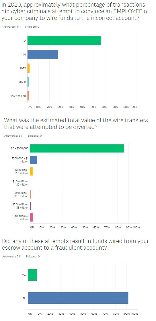 Title insurance professionals reported cyber criminals attempted to trick employees to wire funds to a fraudulent account in a third of all real estate and mortgage transactions, according to ALTA’s 2021 Wire Fraud and Cyber Crime Survey. However, training and education seem to be working as funds were only wired to a fraudulent account in a little over 8% of these attempts.