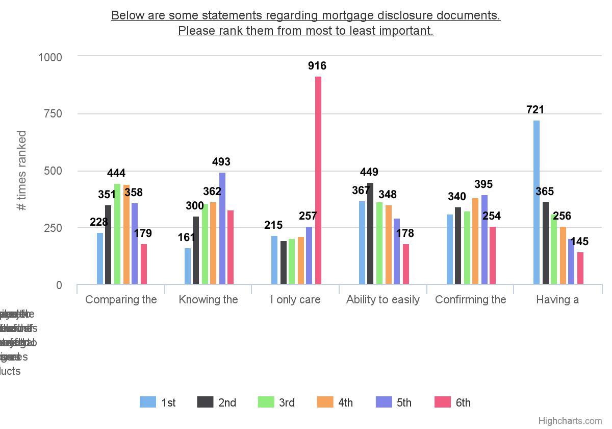 The survey also asked consumers to rank the factors they care about when trying to understand their transaction. Topping the results was getting a detailed breakdown of all the costs for a service, followed by the ability to easily compare estimates to final figures and comparing the disclosure to the actual costs. At the bottom of the rankings is providing marginal cost of optional products and seeing bottom-line amounts like cash-to-close.