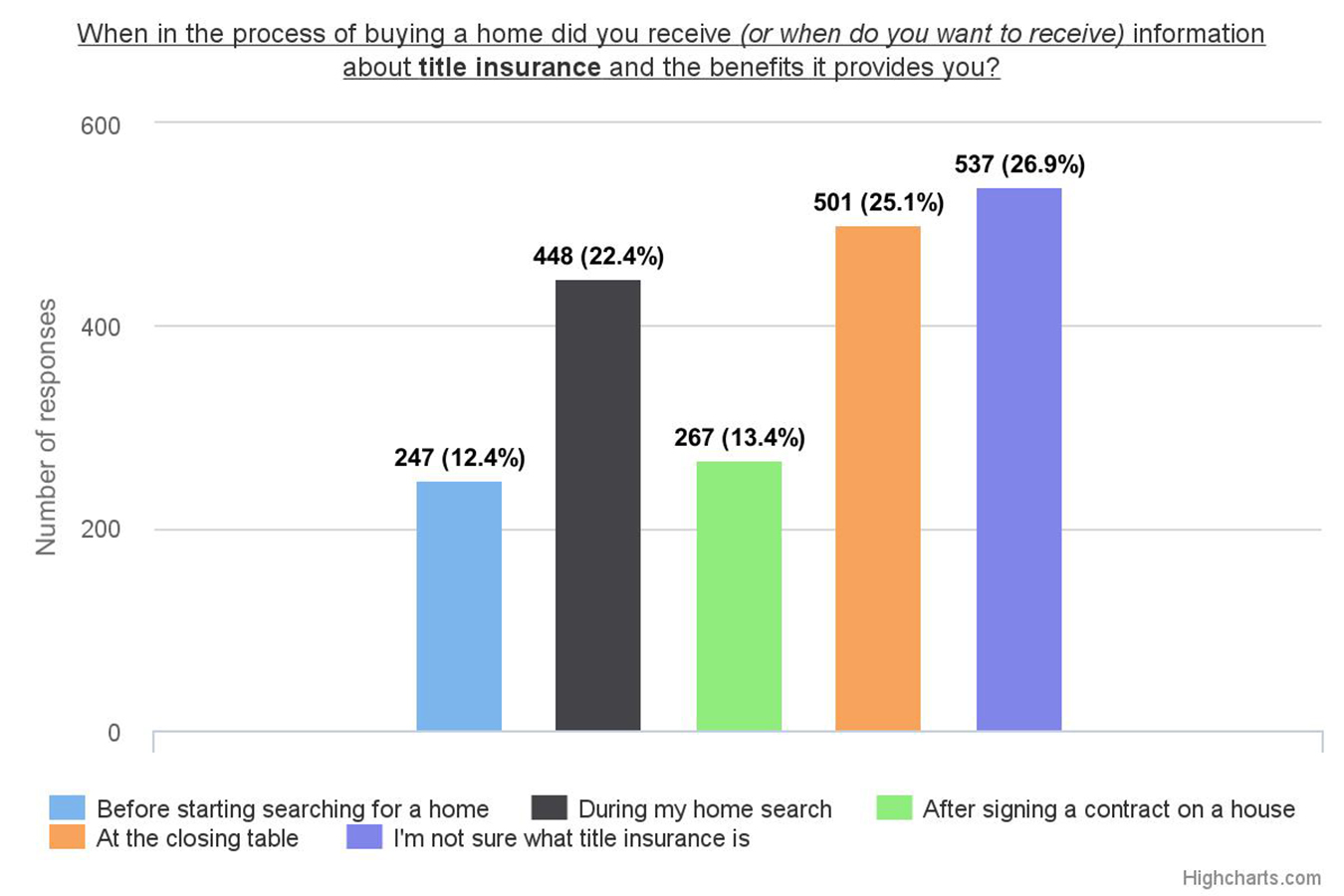 Additionally, survey results reinforced the continued need to educate consumers about the benefits of title insurance earlier in the transaction. More than half of those surveyed indicated they either received information about title insurance at the closing table or didn’t know about the product.